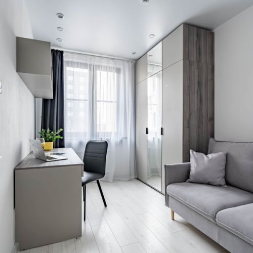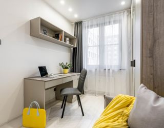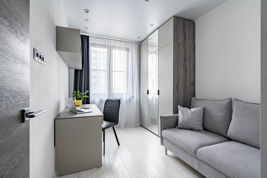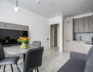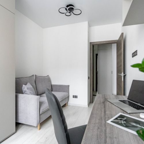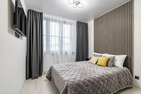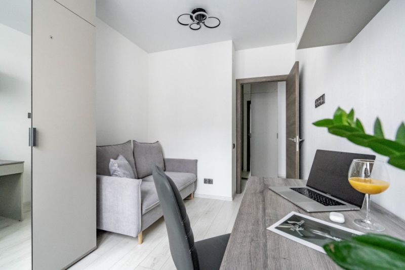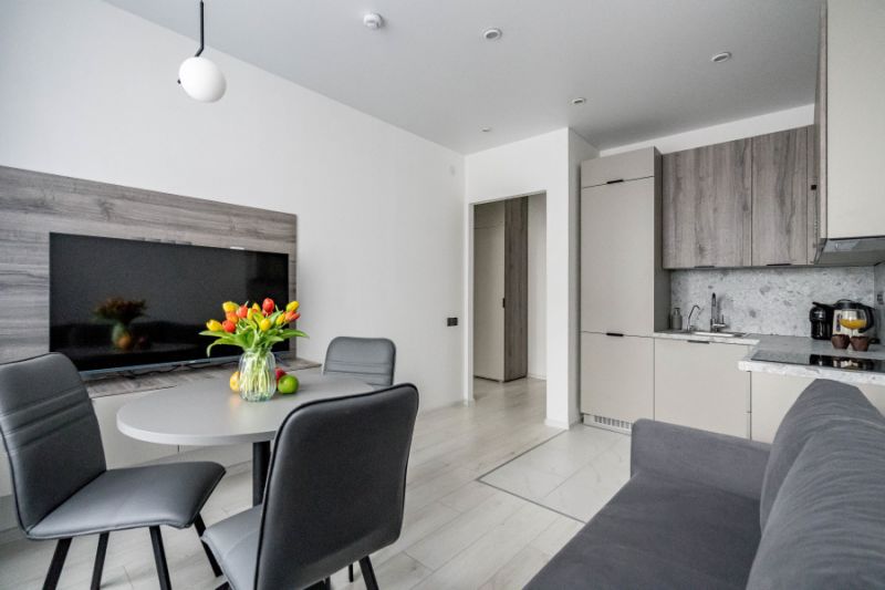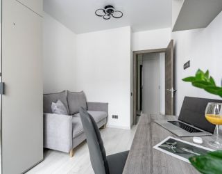 Апартаменты расположились в 5-этажном жилом доме. Они оснащены отдельной спальней, кабинетом и кухней-гостиной. С комфортом могут разместиться 4 человека. В спальне есть двуспальная кровать, в кабинете — раскладной диван, а в гостиной — еще один раскладной диван. В каждой из комнат имеется по одному большому Smart TV. В апартаментах предусмотрен раздельный санузел, что является дополнительным удобством. В ванной комнате установлена стиральная машина с функцией сушки, а также предоставлены все необходимые средства гигиены. Среди прочих удобств — полностью оснащенная кухня с посудомоечной и кофемашиной, встроенным фильтром для очистки воды, холодильником, плитой, микроволновой печью и посудой.