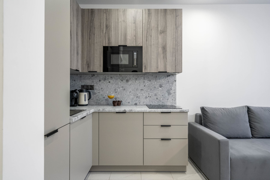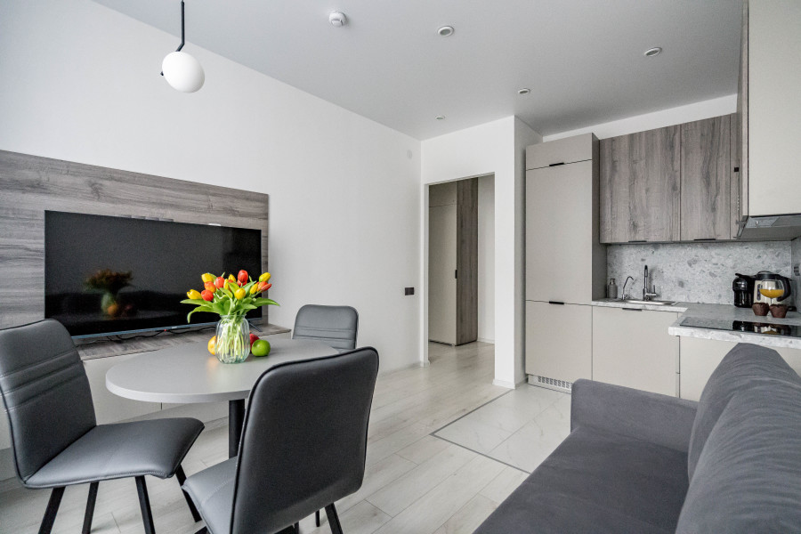 - Оборудование: гладильная доска, кофемашина, микроволновая печь, набор посуды, плита электрическая, посудомоечная машина, стиральная машина, сушилка для белья, телевизор, утюг, холодильник, электрочайник