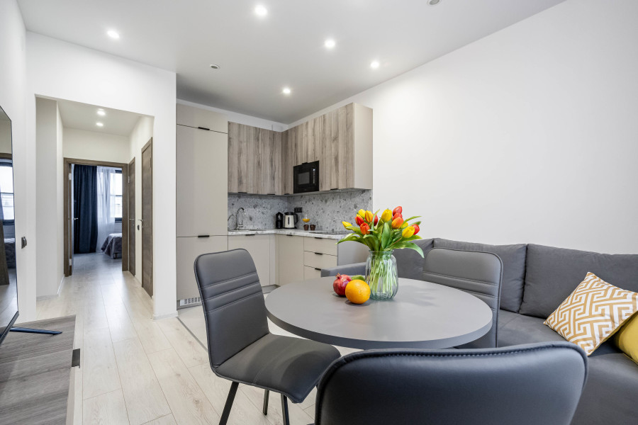 | Апартаменты 4-местные | 46 кв.м. | 4 чел. | Кухня, Мебель (вешалка, диван раскладной, зеркало, кровать двуспальная, прикроватные тумбочки, стол,... |